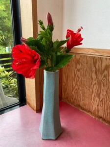 患者様から、真っ赤なハイビスカスの切り花を頂きました。